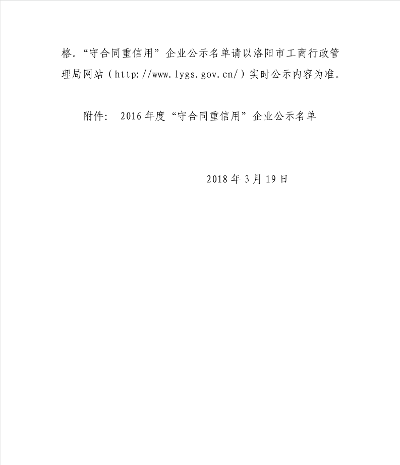近期在洛陽市工商行政管理局公示的“2016年守合同重信用企業”名單中,我公司名列其中,同時還獲得了省守重企業稱號。